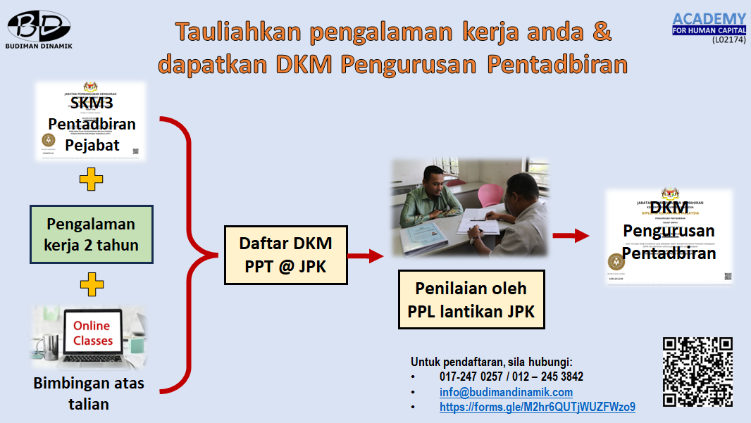 Budiman Dinamik Sdn Bhd ada menyediakan perkhidmatan membantu individu yang mempunyai SKM3 Pentadbiran Pejabat / Pengurusan Pejabat untuk mendapatkan Diploma Kemahiran Malaysia (DKM) melalui kaedah Pengiktirafan Pencapaian Terdahulu (PPT) melalui penilaian amali. Tidak perlu menyediakan portfolio, hanya hadir penilaian amali selama 1 hari. Kepada yang berminat, boleh lengkapkan google form ini untuk pendaftaran Borang pendaftaran DKM PPT atau DM 017-268 3121.