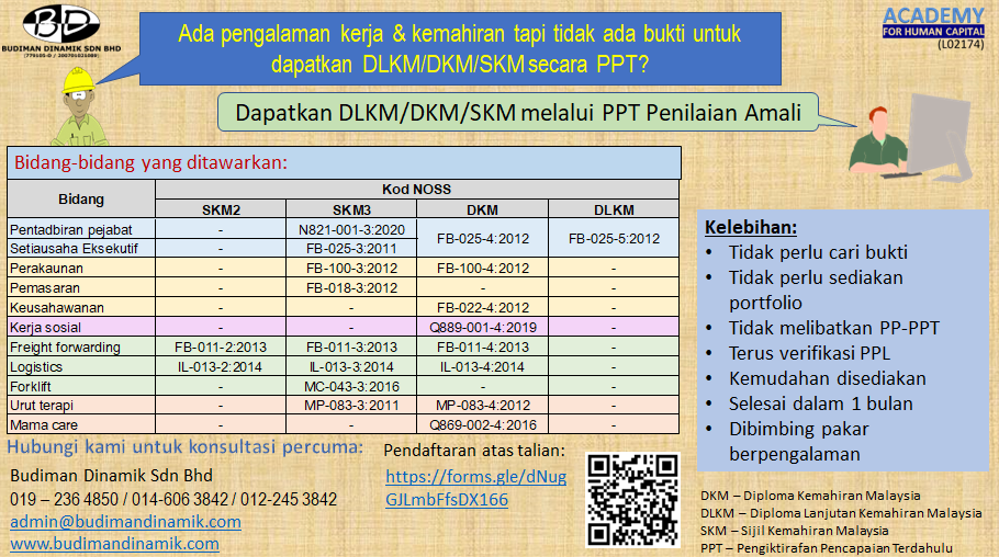 Budiman Dinamik Sdn Bhd ada menyediakan perkhidmatan membantu individu yang mempunyai SKM3 Pentadbiran Pejabat / Pengurusan Pejabat untuk mendapatkan Diploma Kemahiran Malaysia (DKM) melalui kaedah Pengiktirafan Pencapaian Terdahulu (PPT) melalui penilaian amali. Tidak perlu menyediakan portfolio, hanya hadir penilaian amali selama 1 hari. Kepada yang berminat, boleh lengkapkan google form ini untuk pendaftaran Borang pendaftaran DKM PPT atau DM 017-268 3121.